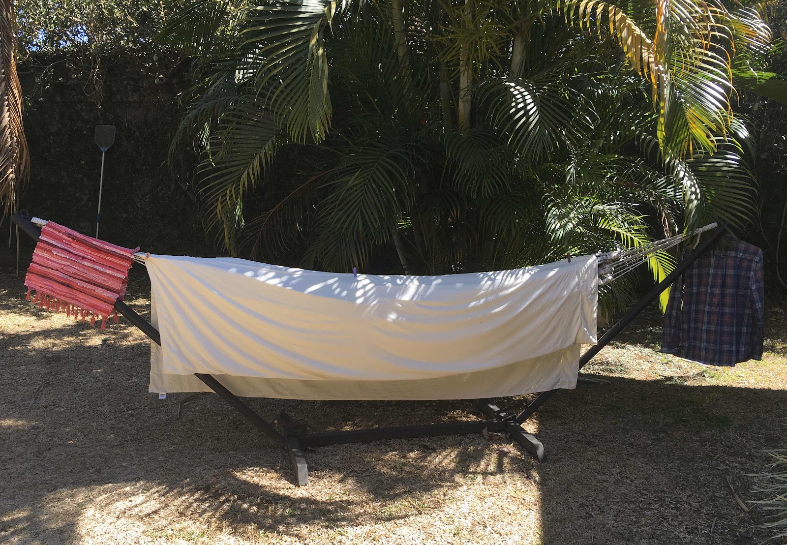 There are at least three more of these clusters up there. I worry about our Cat when he decides to sharpen his claws on this tree. I don’t want to hang any laundry under it in case one more bunch decides to fall when I am pinning up wet clothes. That’s why I hung some things on my hammock.